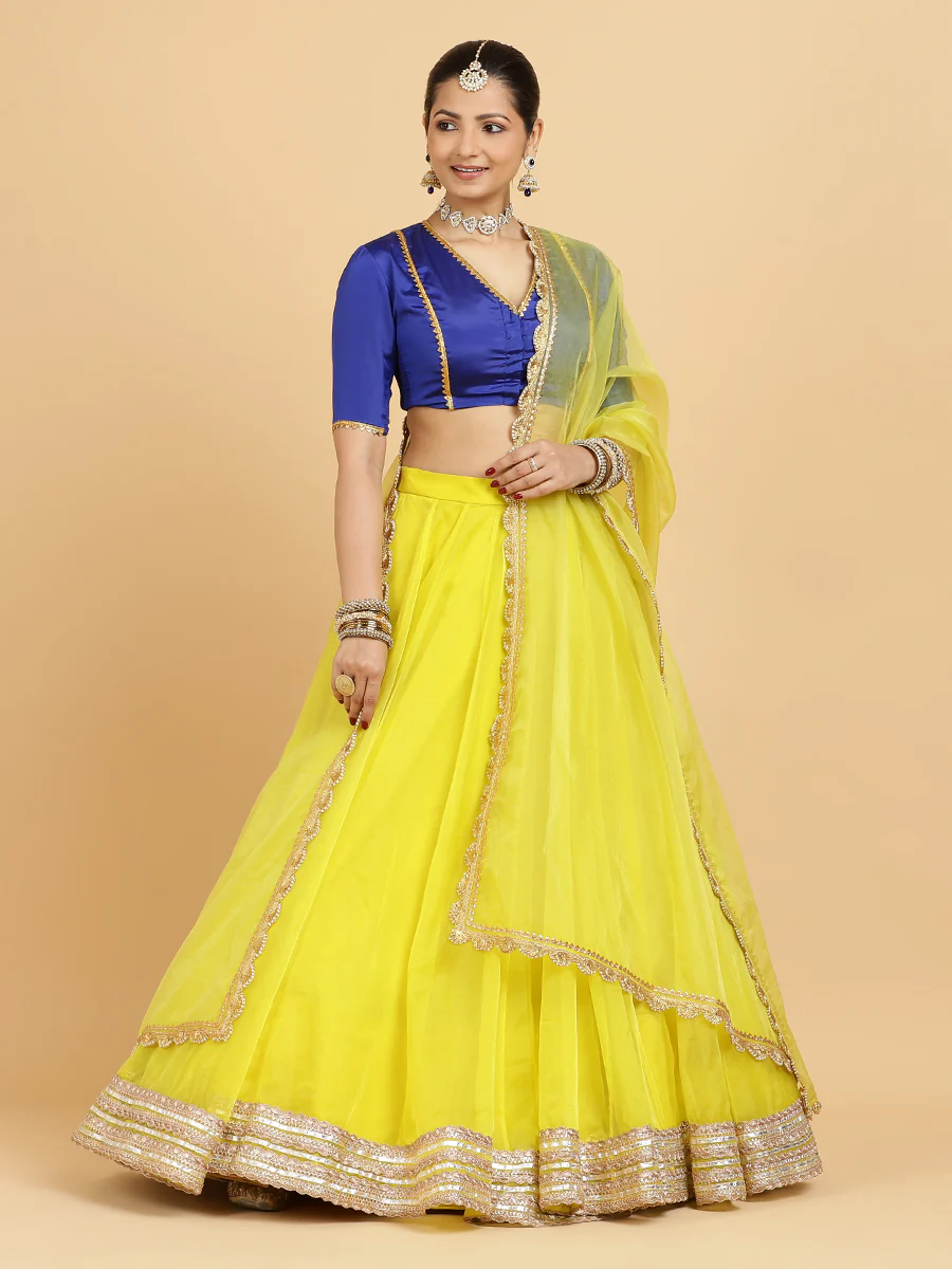 Farah Begum 4-Pc Lehenga Set x Tyohaar | Lemon Yellow Lehenga, Cobalt Blue Blouse with Saher Lemon Yellow Dupatta and Cancan Skirt