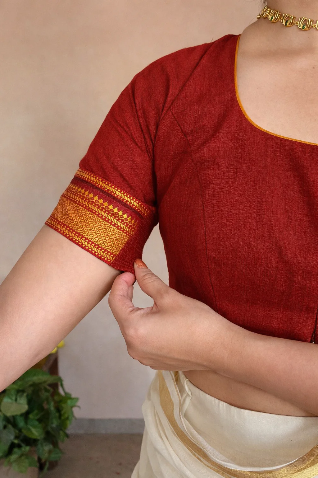 The elbow sleeves feature refined zari borders that add a luxurious handcrafted finish. A classic round neckline, 100% cotton lining, and FlexiFit construction provide structure, comfort, and a polished silhouette that pairs effortlessly with silk and handloom sarees.