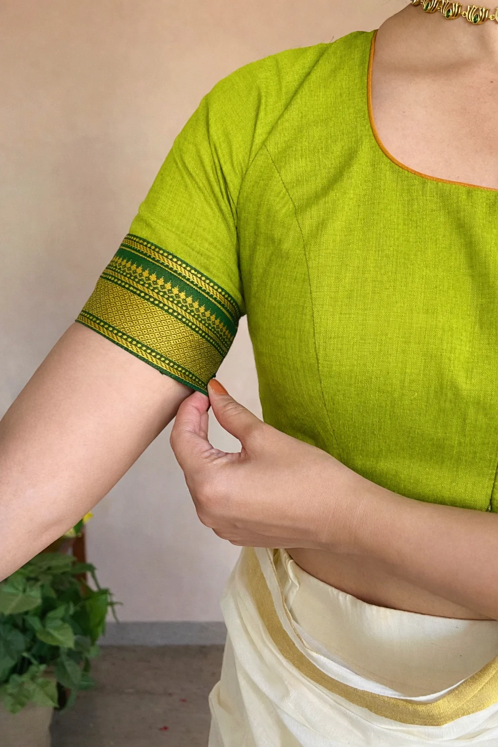 Introducing Revathi x Tyohaar | Elbow Sleeves Radiant Citron Mangalgiri Cotton Saree Blouse. Brighten your traditional look with this radiant citron blouse, tailored in premium Mangalgiri cotton for breathable comfort and refined elegance. Its lively tone brings freshness to both festive and cultural styling.