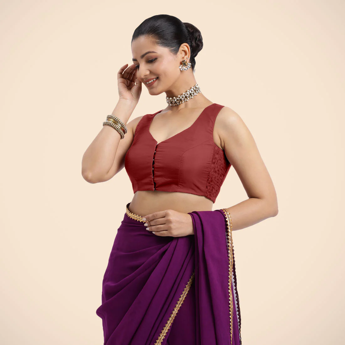 Nazia x Rozaana | Auburn Red Sleeveless FlexiFit™ Saree Blouse with Front Open Curved V Neckline with Deep Back and Dori