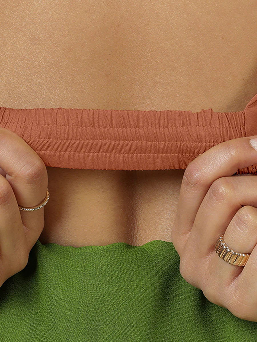 Introducing the Zeba x Rozaana Metallic Copper Sleeveless Saree Blouse, a stunning addition to your festive wardrobe. Crafted with the modern woman in mind, this blouse combines traditional elegance with contemporary design, making it perfect for any party or festive occasion.
