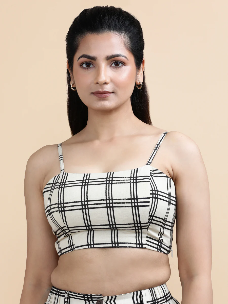 Marie x Soma | Women's Cropped Top in Cream Windowpane Check Block Print Cotton