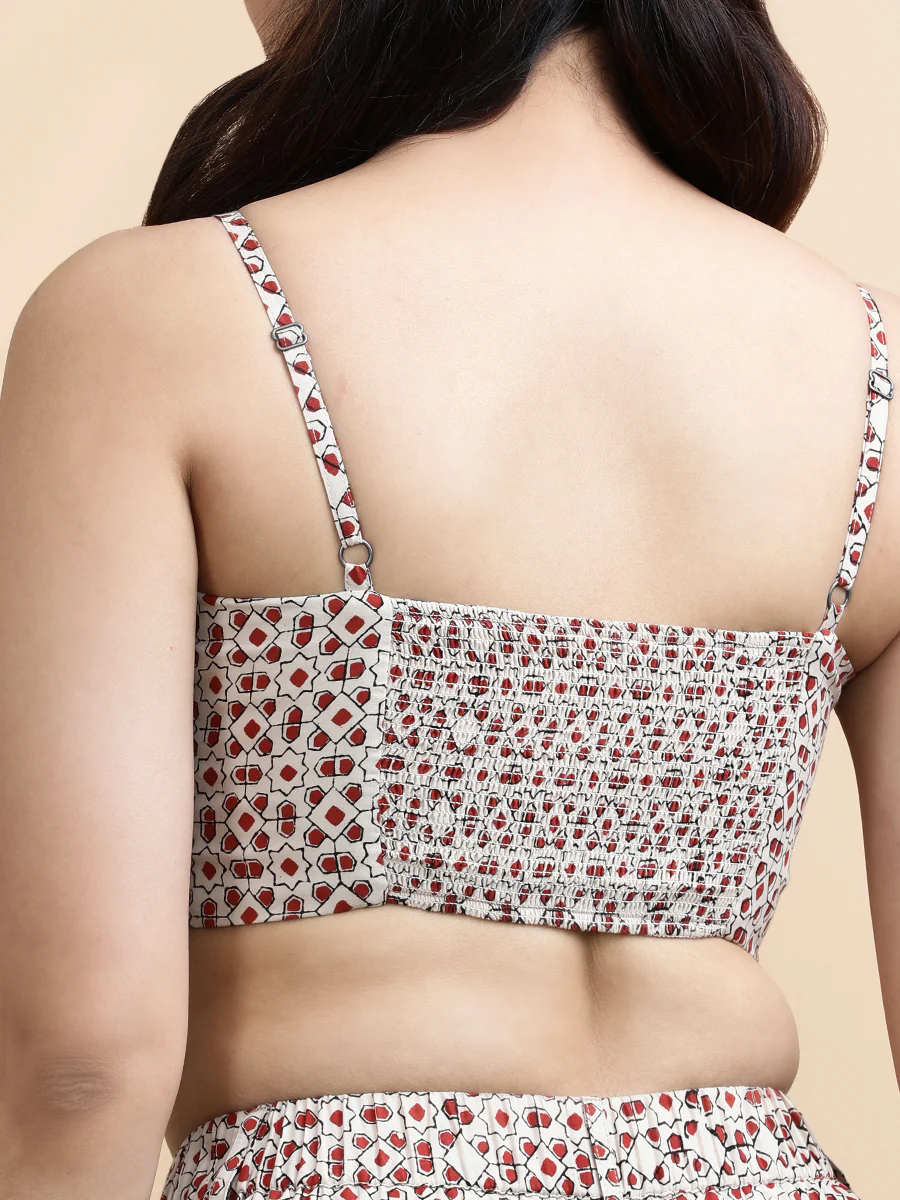 Esther x Soma | Women's Cropped Top in Cream & Red Geometric Block Print Cotton