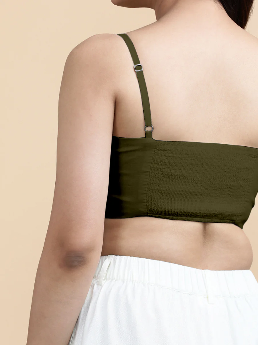Infused with earthy charm, the Gloria x Soma cropped top in Deep Olive Green offers a harmonious blend of elegance and ease. The cotton-linen blend keeps it breathable yet structured, while the rich green hue lends a sophisticated, grounded appeal.