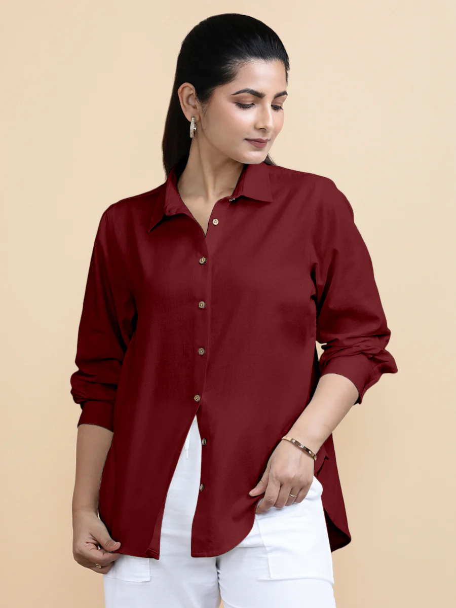 Designed with a loose fit, full sleeves, and a classic collar, this breathable cotton-linen blend shirt is ideal for both professional and casual settings. The curved high-low hem and hip-length cut create a flattering silhouette that transitions seamlessly from work to leisure.
