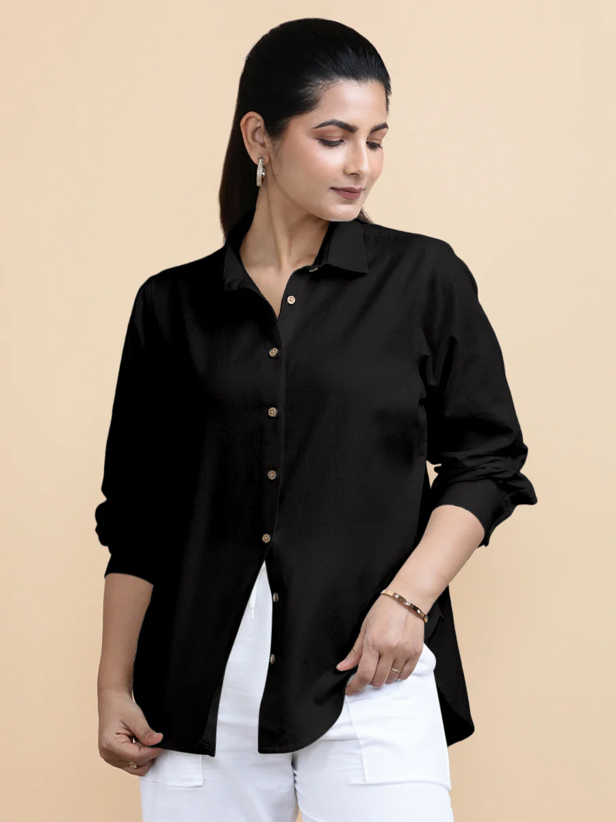 Designed with a loose fit, full sleeves, and a classic collar, this breathable cotton-linen blend shirt offers comfort without sacrificing sophistication. The curved high-low hem and hip-length cut provide an elegant drape that pairs effortlessly with everything from tailored trousers to casual denim.